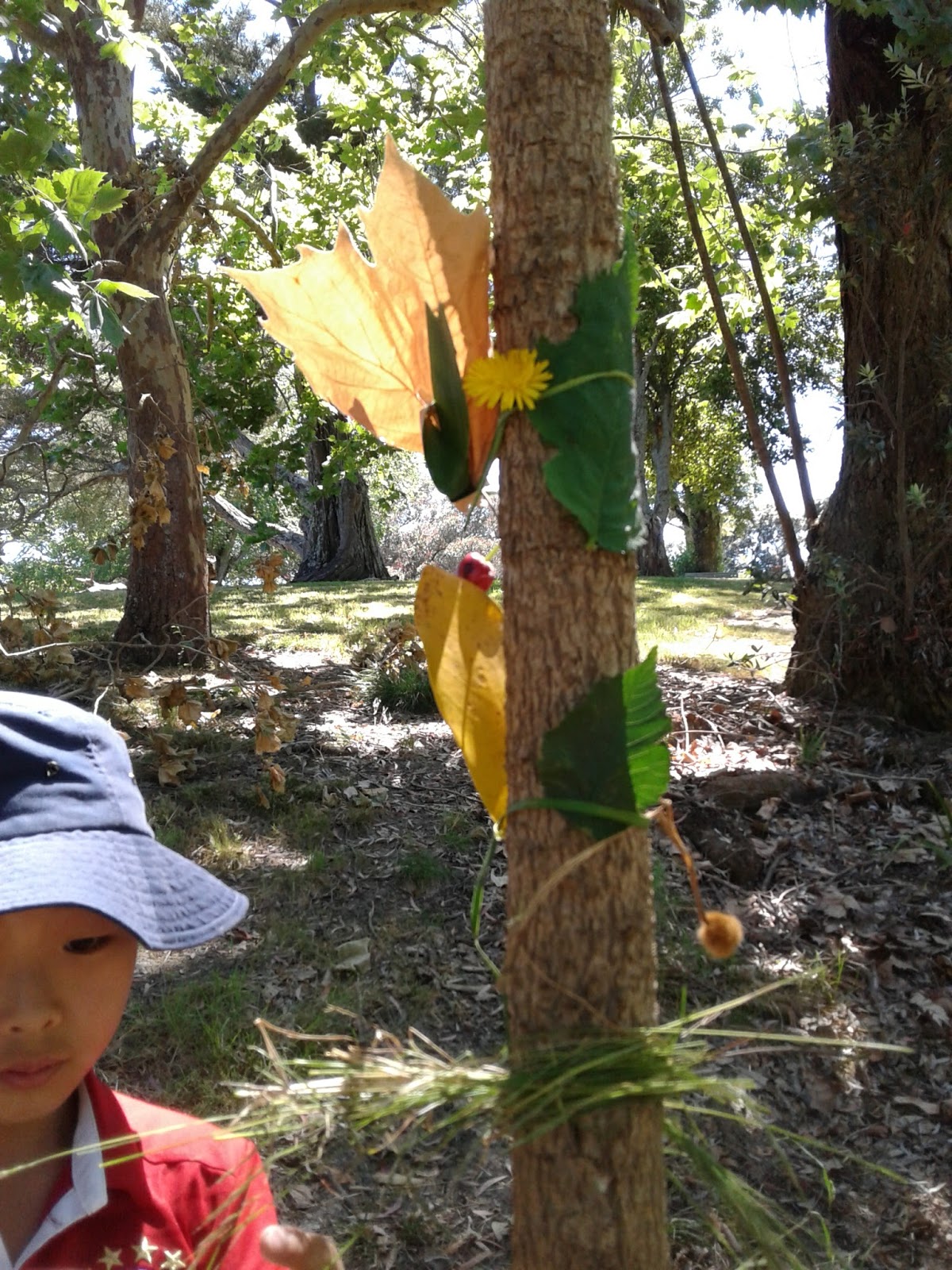 Tying found materials around the trunk.